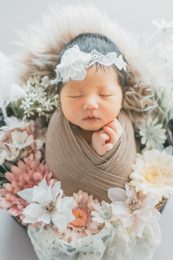 この時期の赤ちゃんって、とても体が柔らかいので、それを活かした可愛らしい写真を残すことができます。生後3週間を過ぎてしまうと、体が硬くなってきてしまうので、この時期だけでの特別な写真になります。